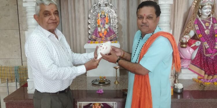 On 01/08/2022 Monday, as there was no big conch in the newly built temple of Gayatri Mata in the village of Moti Virani, a resident of Nana Angiya, now a resident of Bakuda, Vishnupur district… Mr. Vrijlal Bhanji Parasia, he offered a big conch. He offered a Conch which was accepted by Mr. Puruhit Vinu Maraj,