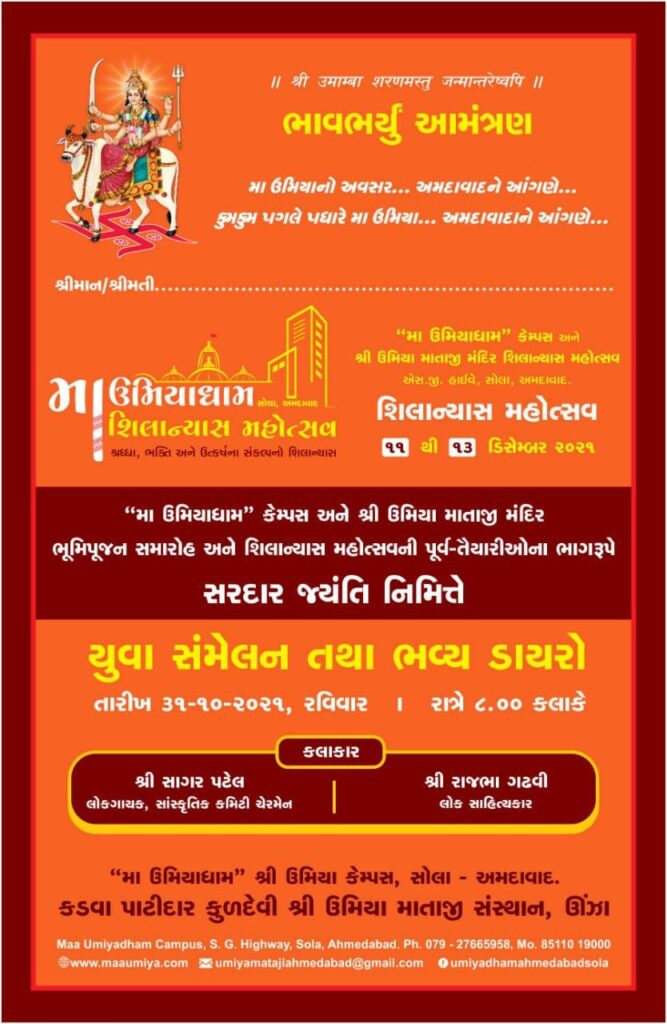 ઉમિયાધામ ખાતે ઉમિયા માતાજીના મંદિરની સ્થાપના માટે આમંત્રણ