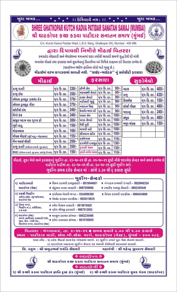 કચ્છ કડવા પાટીદાર સમાજ, ઘાટકોપર દ્વારા દિવાળી નિમિત્તે મીઠાઈનું વિતરણ